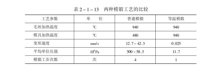 表2-1-13為鈦合金渦輪盤鍛件的兩種模鍛工藝的比較。
