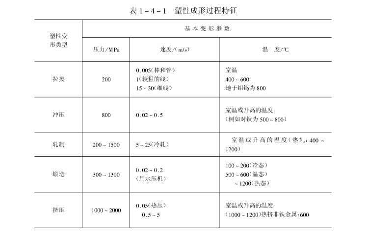 塑性成形中的摩擦不同于機(jī)械傳動過程中的摩擦,它是一種高壓下的摩擦。對受重載荷的軸承,工作時(shí)所受的壓力僅為20~40MPa,而塑性成形時(shí)與工具接觸的表面所受的壓力高達(dá)1000~2000MPa。不同塑性成形時(shí)的模具與毛坯相接觸處的壓力大小列于表1-4-1。